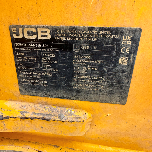JCB 6T-2 Site Dumper. - Powershuttle transmission. - Roadlight Kit. - Amber & Green Beacons. - Front Tip
